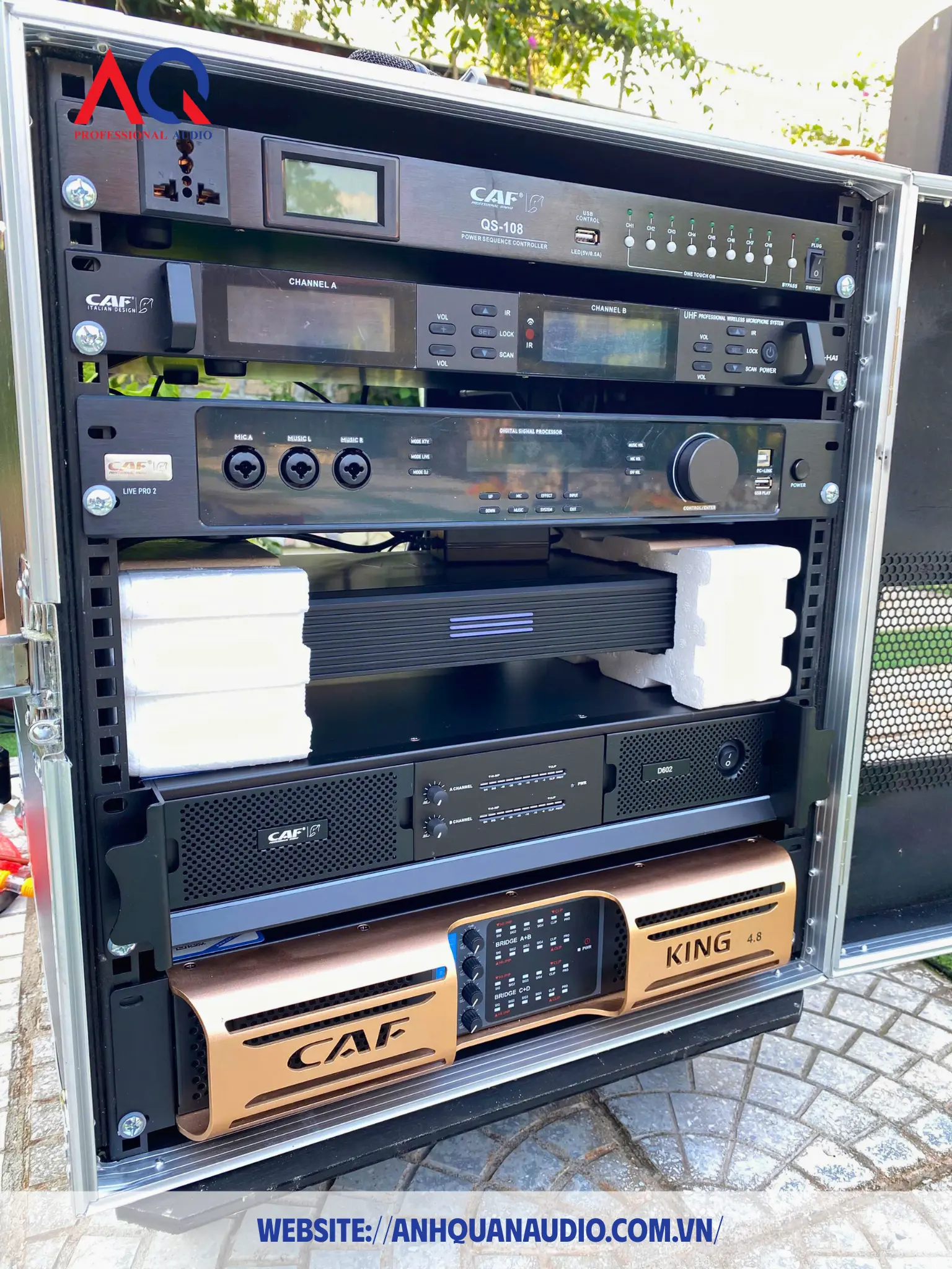 Toàn bộ thiết bị sử dụng đồng bộ thương hiệu CAF AUDIO – dòng âm thanh cao cấp chuyên dùng cho karaoke, giải trí và sự kiện.